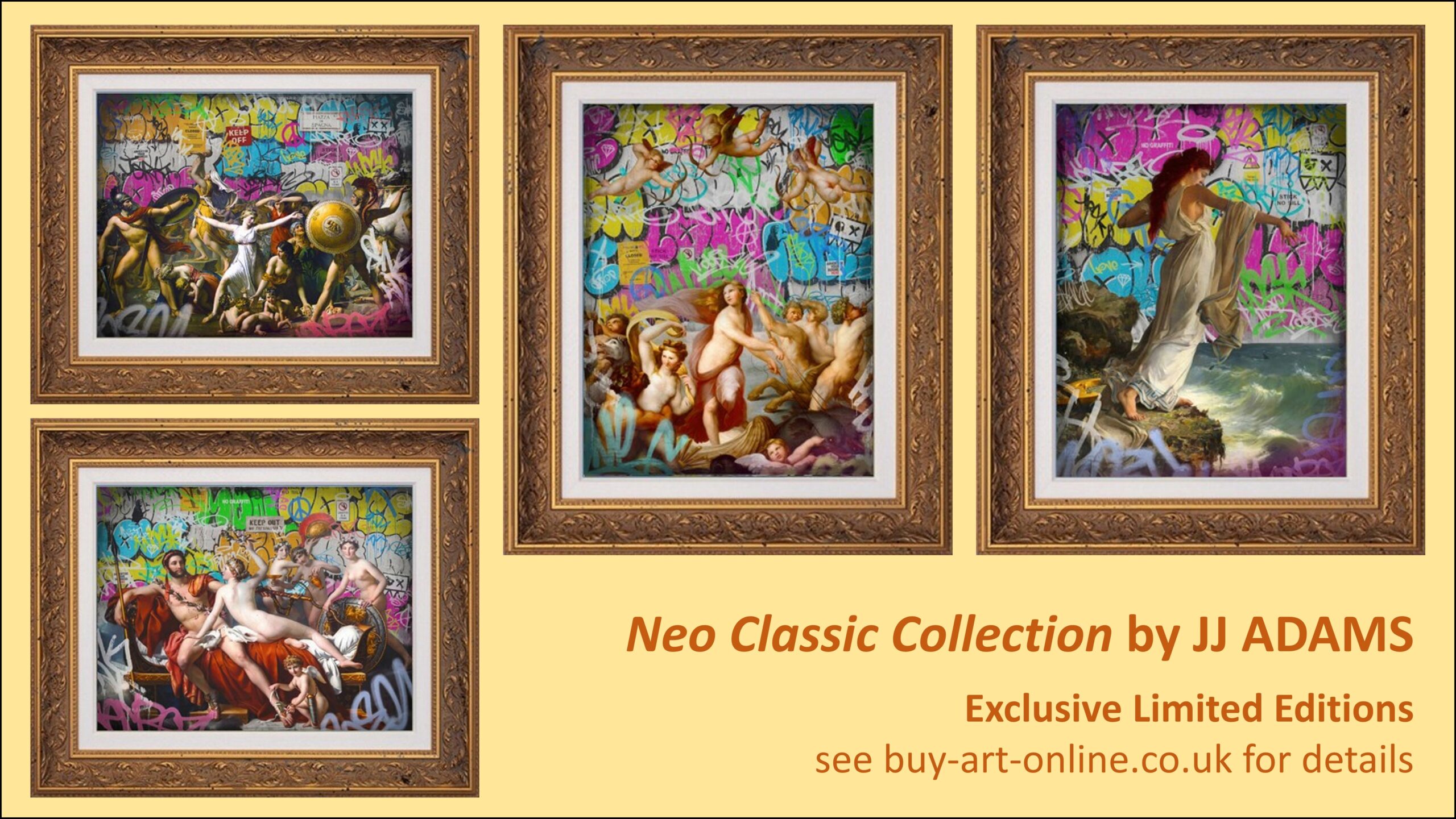 JJ Adams has created a Neo Classical Collection with an exclusive range of neo pop classics in limited editions of just 25. Featuring four classical themes with pop art backgrounds and graffiti splattered ornate frames.