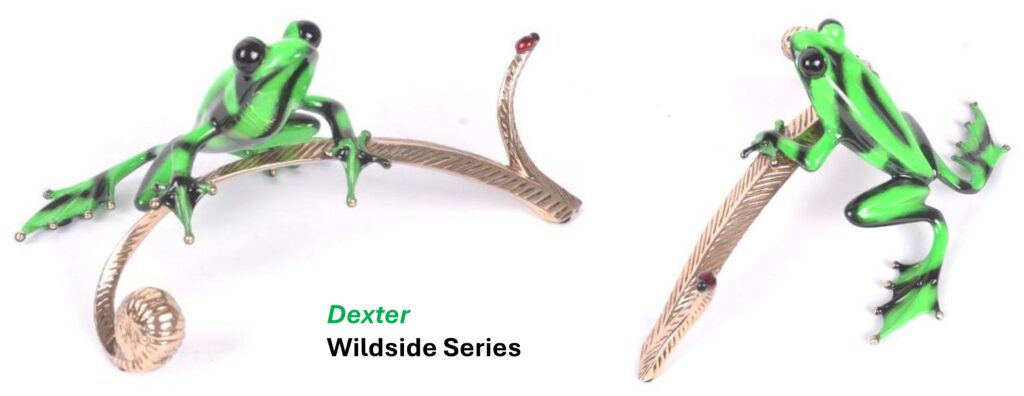 Leaning against a polished bronze reed, accompanied by the iconic Tim Cotterill ladybug, Dexter is a stunning addition to this series. The vivid lime green patina, randomly patterned with saturated black-toned markings, masterfully depicts the coloration of the Green and Black Poison Dart Frog.