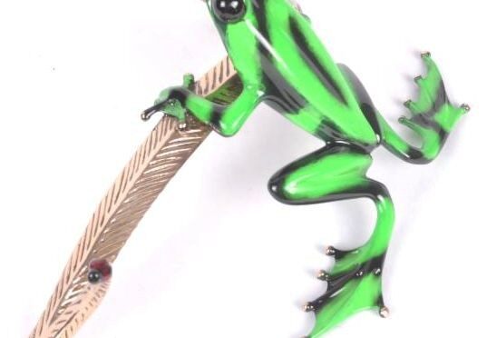 Leaning against a polished bronze reed, accompanied by the iconic Tim Cotterill ladybug, Dexter is a stunning addition to this series. The vivid lime green patina, randomly patterned with saturated black-toned markings, masterfully depicts the coloration of the Green and Black Poison Dart Frog.