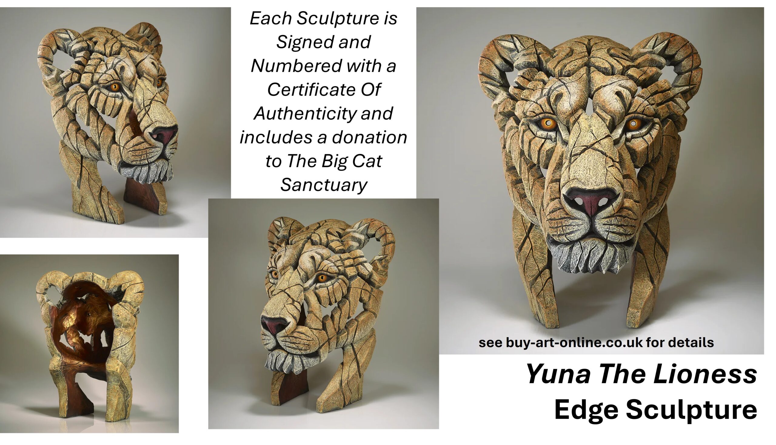 Yuna The Lioness is a special sculpture created by Matt Buckley to support The Big Cat Sanctuary, a registered charity near Ashford in Kent. It is Signed and Numbered by him and includes a Certificate Of Authenticity as well as a donation to The Big Cat Sanctuary.