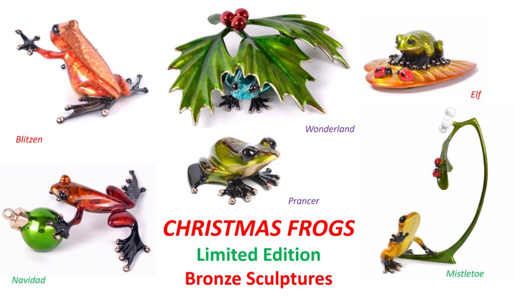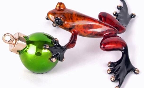The Christmas Bronze Frog for 2025 is Navidad. Tim Cotterill has captured the magic of the season with this radiant red bronze frog, fascinated by a brilliant green holiday ornament. With its suitably seasonal patina and signature whimsy, the 2025 Christmas sculpture, truly embodies the wonder, joy, and spirit of the holiday.
